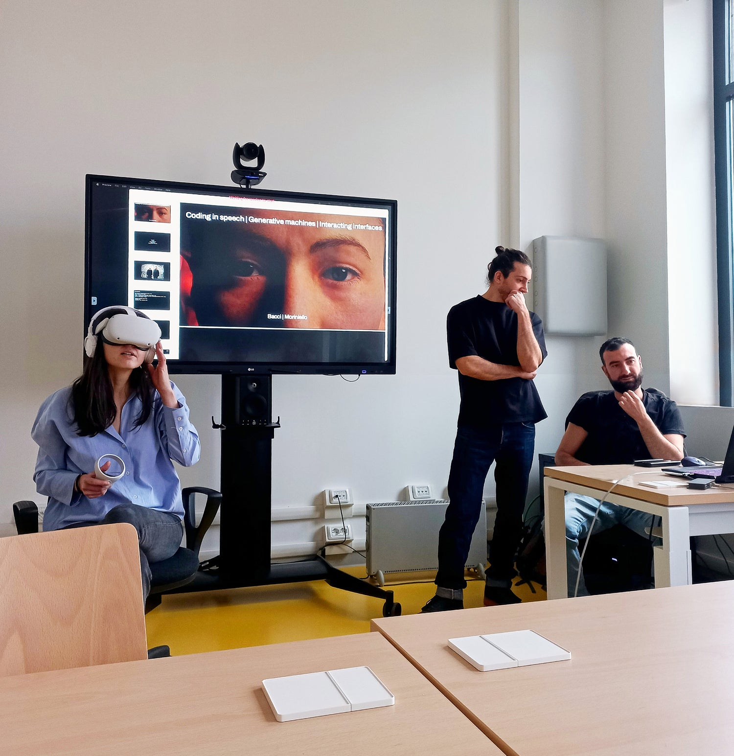 A core decision of the project is to allow only the user wearing the headset to hear the AI’s responses, excluding the audience from this aspect of the interaction. This approach emphasizes the human and subjective aspects of the interaction. Not being able to hear the AI’s voice encourages deeper reflection, urging the audience to develop critical awareness about our time and the challenges posed by technology.