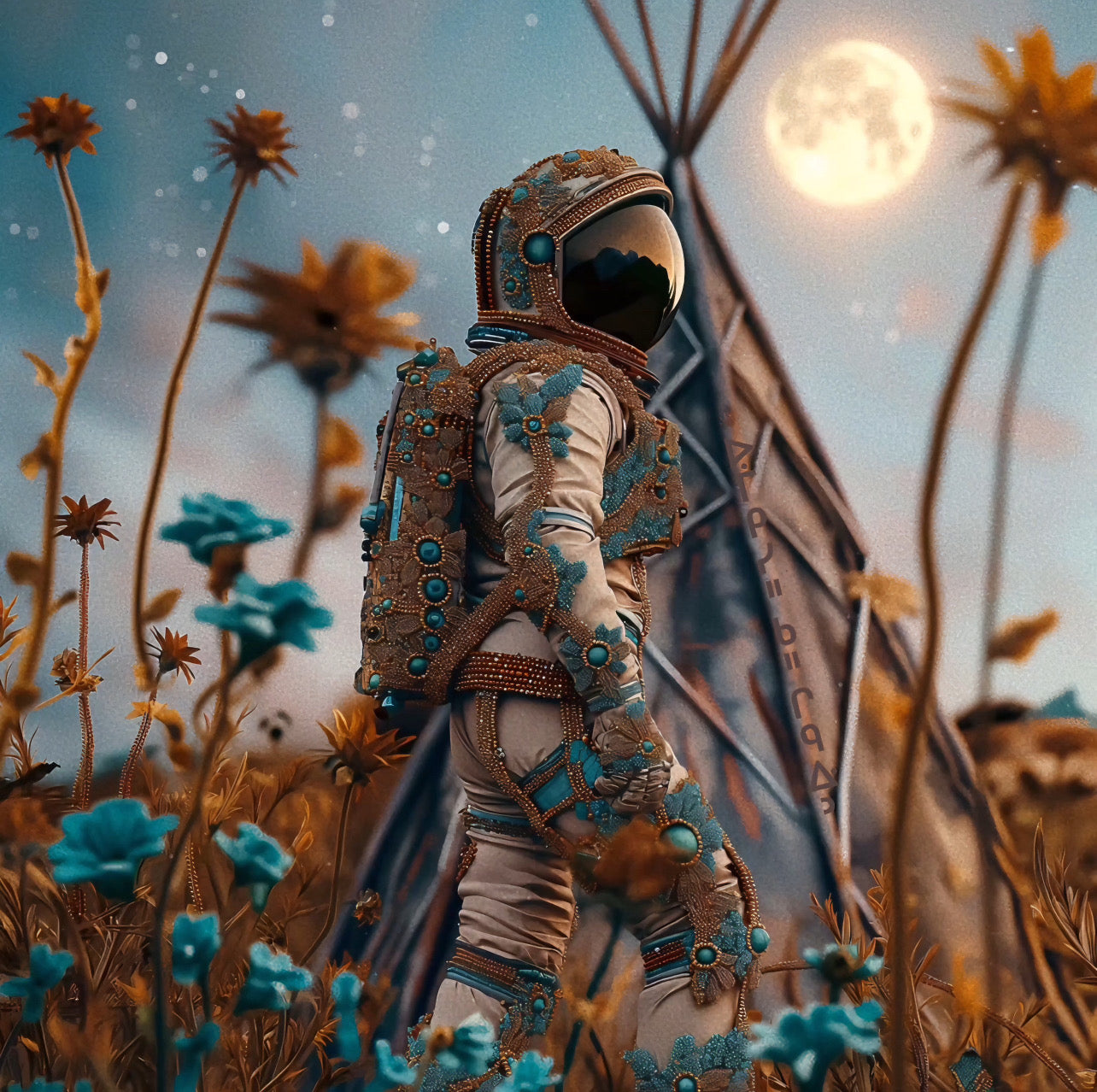 For me as an vegan “bear clan” woman (matriarchal clan system) it is imperative for me to break away from ceremonial regalia stereotypes of indigenous such as the feather headdress including primarily ancient earth shamanism tropes. the indigenous globally are very diverse in language and ceremonies, and I choose to expand my vision to unknown galaxies.